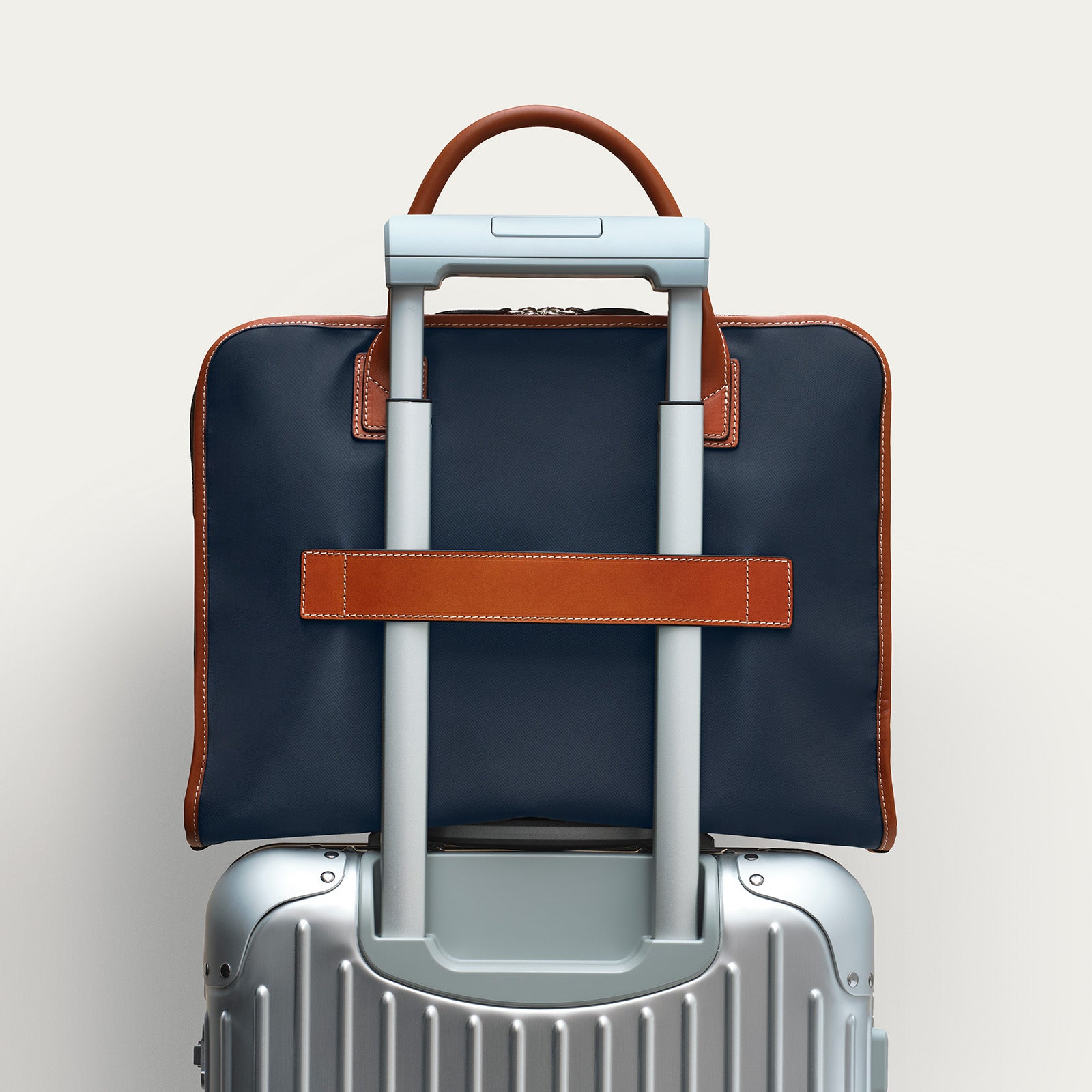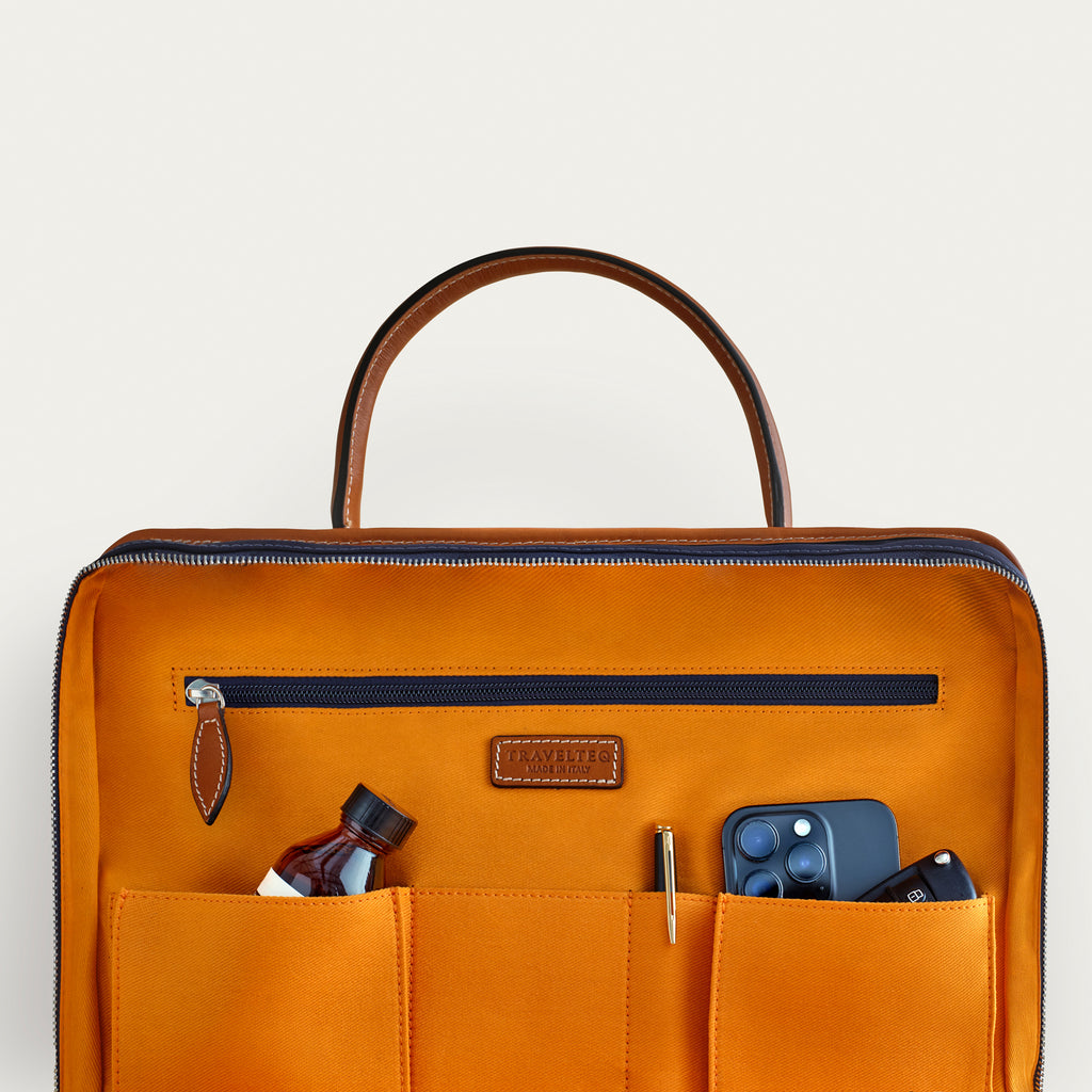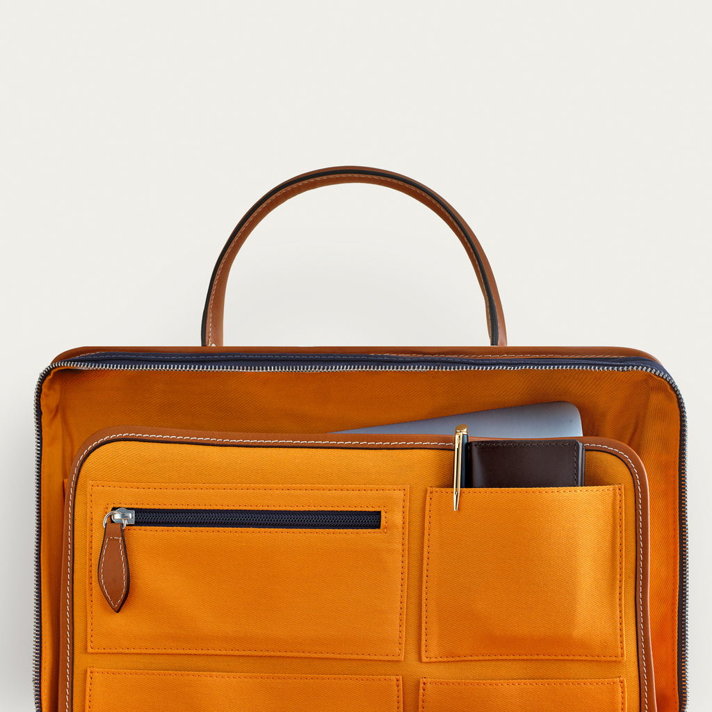 A bold fusion of classic craftsmanship and modern design, the Briefcase, turned inside out. The Inside Out combines premium cognac Vachetta leather with vibrant Partex Group nylon panels in deep navy, racing green and royal orange. The result? A bag that’s lighter, less